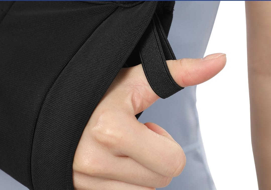 Bucle para el pulgar para más apoyo: las trabillas elásticas para el pulgar están cosidas en ambos lados. Ayuda a descansar el pulgar cómodamente sobre él, proporciona apoyo adicional.